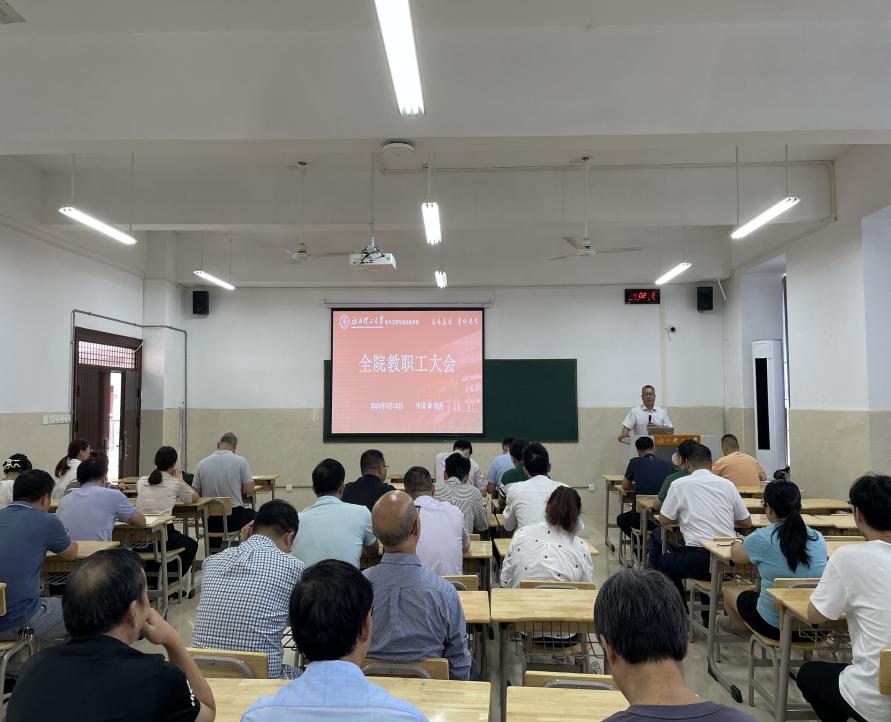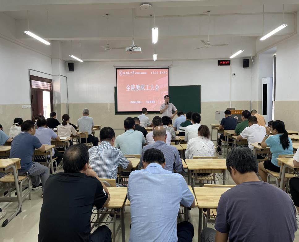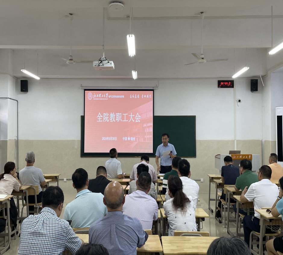 学院党委书记于仲安首先带领全体教职工学习了习近平总书记在全国教育大会上的重要讲话精神,深刻领会了国家对教育事业发展的总体要求和战略部署。接着传达了全省教育系统安全稳定会议的精神,要求全体教职工务必提高政治站位,在意识形态、网络安全、消防安全、出行安全等多个维度筑牢安全防线。最后细致介绍了学校当前推进的《2024年“优亲厚友”“近亲繁殖”现象专项整治工作方案》《江西理工大学基建后勤领域专项整治工作实施方案》《关于开展酒驾醉驾、无证驾驶专项整治工作方案》等三项专项整治工作,并就学校新一轮“四定”工作部署进行了说明,明确了实施办法与要求。