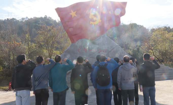 来到于都红军小镇,党员们踏上红军长征小道,每一步都仿佛能感受到革命先辈们的坚定步伐和顽强意志。沿途,党员们还分享了红军长征故事,更加深刻地理解了红军长征的伟大意义和深远影响。在红军广场上,面对着鲜红的党旗,龚姚腾同志带领大家重温入党誓词,誓言声声,激荡着每个人的心灵。重温誓词后,全体党员合影留念,以此表达对党的无限忠诚与对革命先烈的深切缅怀。