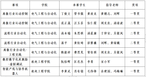 在全国总决赛中,电气工程与自动化学院的5支队伍获全国一等奖1项,全国二等奖4项。其中,在离散行业运动控制赛项中获一等奖、二等奖各1项,在流程行业自动化方向赛项中获二等奖2项,在离散行业自动化-工程实践赛项中获二等奖1项。机电工程学院的2支队伍在数控数字化双胞胎-虚拟调试方向赛项中获一等奖1项,在智能产线与协作机器人方向赛项中获一等奖1项。