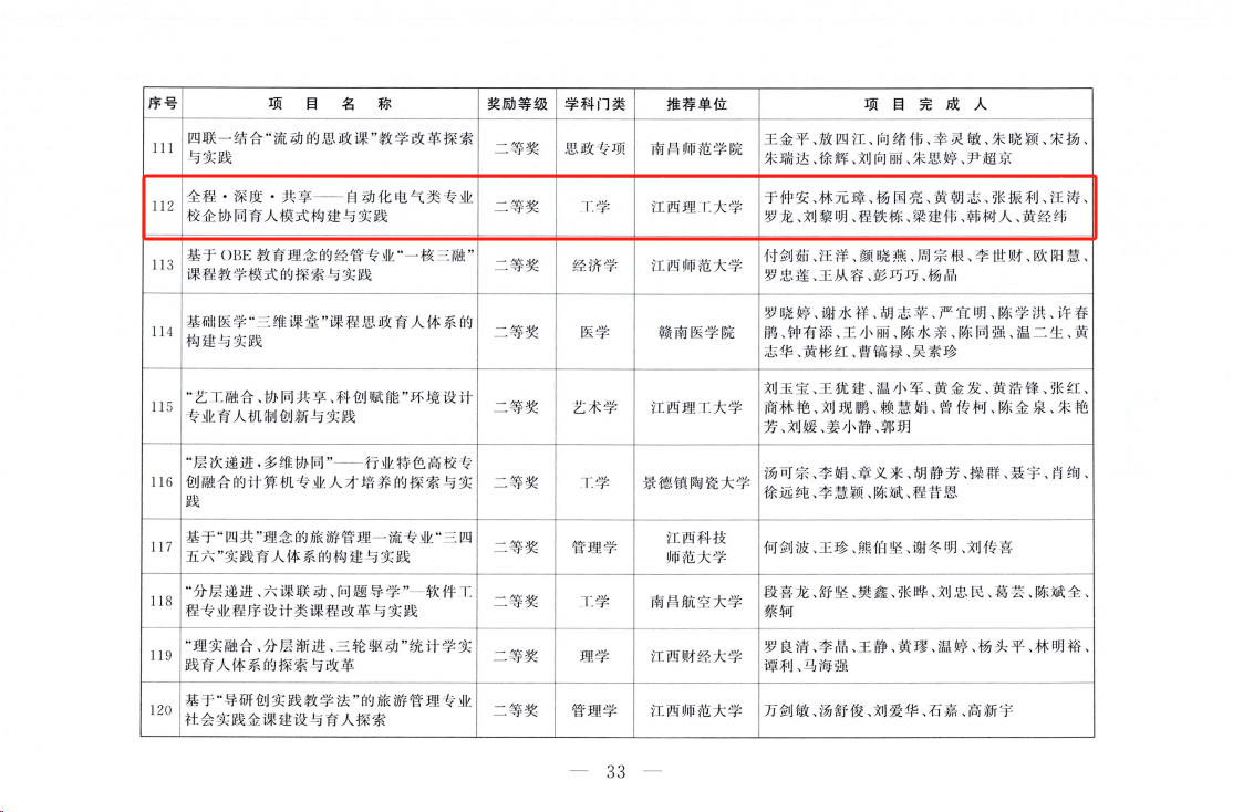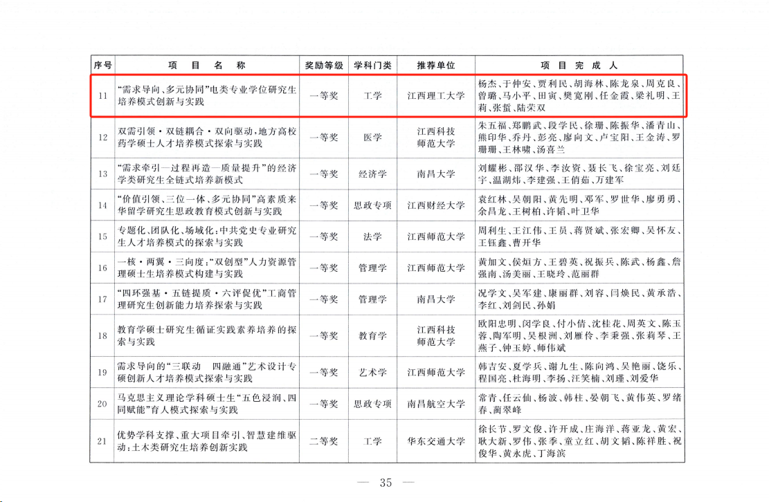 近日,江西省人民政府公布了2022年省级教学成果奖评选结果(赣府字〔2023〕88号),我院共获得省级教学成果奖一等奖一项、二等奖一项。其中,由杨杰教授主持的《“需求导向、多元协同”电类专业学位研究生培养模式创新与实践》荣获研究生教育类教学成果奖一等奖;由于仲安教授主持的《全程·深度·共享——自动化电气类专业校企协同育人模式构建与实践》荣获高等教育类(本科层次)教学成果奖二等奖。