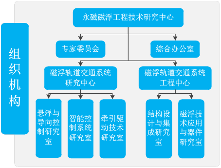 在组织机构方面,包括专家委员会、磁浮轨道交通系统研究中心、磁浮轨道交通系统工程中心和综合办公室四部分。其中,磁浮轨道交通系统研究中心包括悬浮与导向控制研究室、智能控制系统研究室、牵引驱动技术研究室,磁浮轨道交通系统工程中心,包括结构设计与集成研究室和磁浮技术应用与器件研究室。