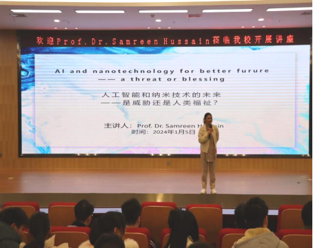 1月5日,卡拉奇达伍德工程技术大学副校长Samreen Hussain教授在三江校区图书馆报告厅为同学们带来了以“人工智能和纳米技术的未来——是威胁还是人类福祉”主题的讲座,开云(中国)近三百名同学参加了本次学术报告会。