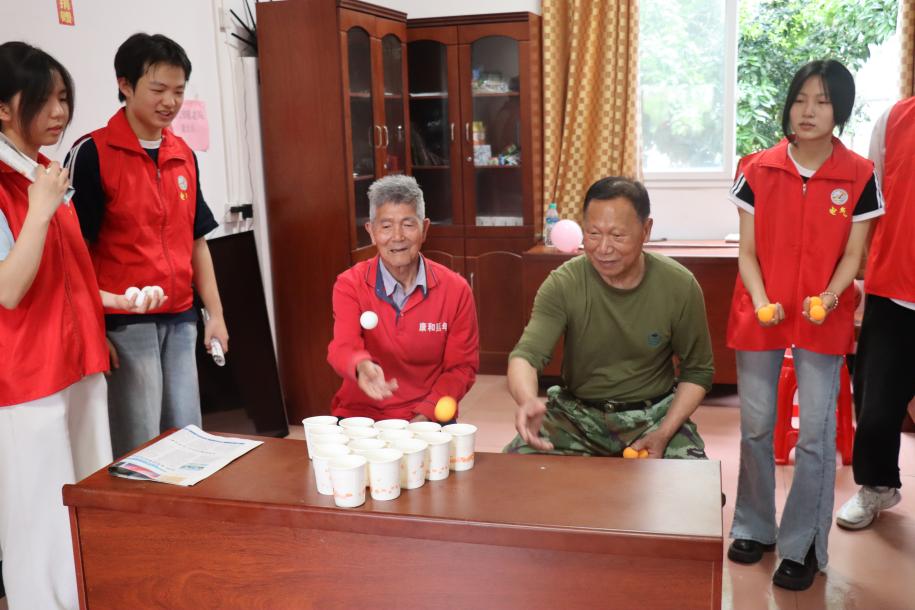 活动还设置了“报纸传气球”“纸杯投球”“纸箱摇乒乓”等互动游戏。在“报纸传气球”中,老人与志愿者默契配合,气球在晃动的报纸间跳跃,现场笑声不断;“纸杯投球”环节,老人瞄准目标,乒乓球落杯的清脆声响与欢呼声交织成欢乐交响曲。最激烈的当属“纸箱摇乒乓”,两位爷爷你追我赶,最终一人以微弱优势胜出,全场掌声雷动。