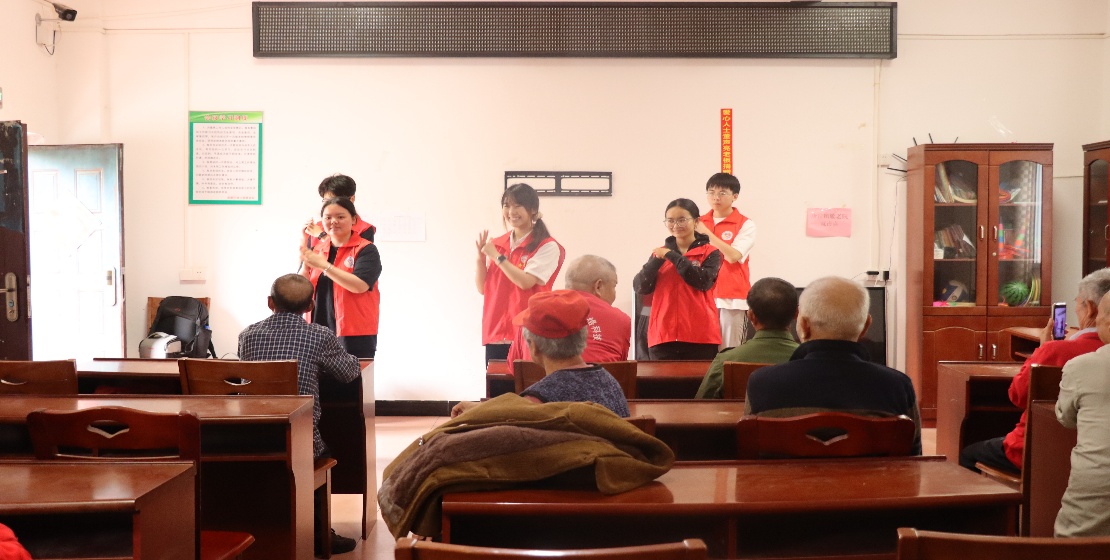 为丰富老人精神生活,志愿者精心准备了文艺表演。舞蹈环节,志愿者随着轻快音乐翩翩起舞,舒展的手臂如柳枝摇曳,旋转的身姿洋溢着青春活力,老人们或拍手打节拍,或笑得合不拢嘴。随后,志愿者化身“魔术师”,从空袋中变出彩带与对联“福如东海长流水,寿比南山不老松”,以奇幻表演送上祝福,引得老人惊叹连连。