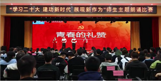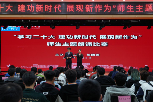 (本网讯 )11月8日下午,由校工会、校团委联合举办的“学习二十大·建功新时代·展现新作为”师生主题朗诵比赛在三江校区三实楼多功能报告厅隆重举行。校党委副书记伍自强,校党委常委、副校长龚姚腾,校工会主席欧阳鹏飞,校团委书记杨智勇以及各分工会、各学院(学部)团委教师代表、学生代表观看了本次比赛。比赛邀请了赣州市合唱协会主席唐玉琴,中国戏剧家协会会员、国家一级演员冷晓枫,赣州市教育局教科所育体美教研员洪赟等嘉宾担任评委。