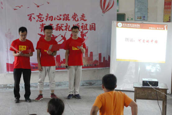 实践队员丛睿臻一曲《新贵妃醉酒》引吭高歌,妖娆变声唱法惹人咂嘴称赞;诙谐幽默的哑剧《拔河比赛》中破坏运动公平规则的裁判最终遭到运动员们的一致对抗,配以夸张的肢体动作与奇特的配乐,告诉人们要尊重竞技规则;六男六女齐声小合唱《如果明天就是下一生》,并有现场钢琴伴奏,在唯美的意境下发人深思“如果明天就是下一生,你将如何度过今天”;寨上村的小朋友们上台唱起实践队员教过的《小跳蛙》,惹人喜爱;本次三下乡带队指导老师曾良仔、学生党员刘书云、李仁超共同朗诵的红色家书《可爱的中国》,告诫我们要坚定对党忠诚,为党和人民的事业勇挑重担,热爱党,时刻听党话,永远跟党走。