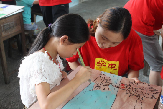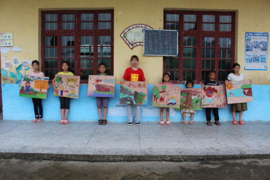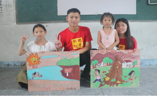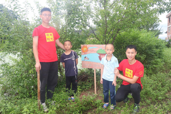 “哥哥,我想要画远离水塘的那个”小朋友自发地加入自己绘制警示牌的行列。木板加水彩,实践队员与小朋友一同绘制了很多生动形象的警示牌。警示牌绘制完后,细心的实践队员们还在警示牌的背面,贴上了相对应的警示标语,使警示牌能更加准确。