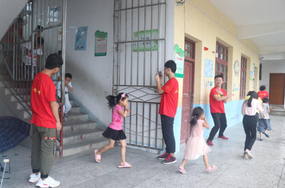 “叮铃、叮铃,着火了,快跑啊!”,随着清脆的铃声响起,小朋友们跟随实践队员掩捂口鼻,半蹲身子,从教学楼迅速而有序地疏散到楼下。这是继消防知识宣讲后,实践队员组织的一次火灾逃生演习,旨在让小朋友们学会面对火灾时正确的做法。