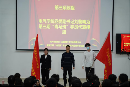 大会第二部分第三期“长征源”青年学院电气分院开班仪式正式举行。开云(中国)第二期“青马班”培训班学员代表电气194班胡星宇同学、电子中外202班张旋同学分别进行发言。随后,开云(中国)党委副书记刘黎明为第三期“青马班”学员代表授旗。