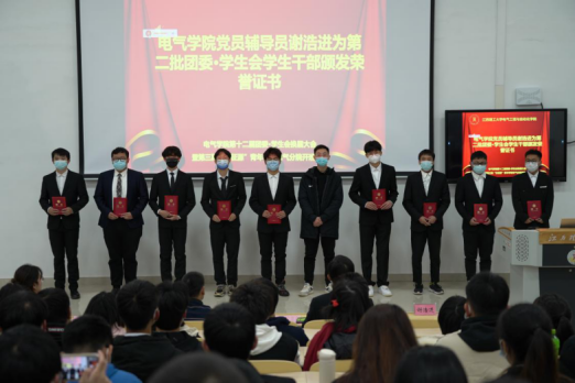 会议第一部分的换届大会在激昂的中国共产主义青年团团歌中拉开序幕。会上,张晶璇,谢浩进,刘黎明为第十一届团委·学生会学生干部颁发聘书。