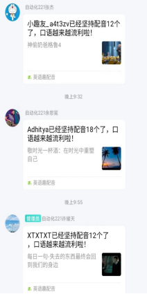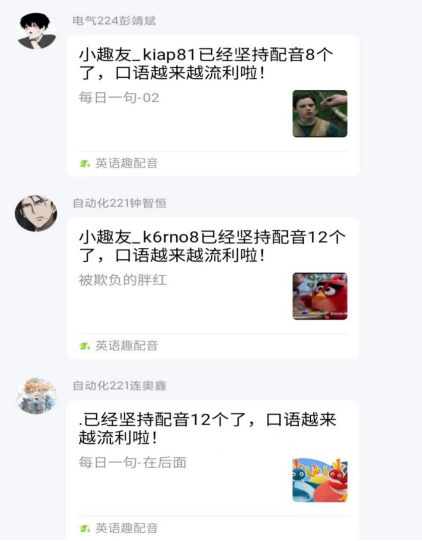 这个活动,让成员自主在手机软件上配音,自行感受英语语言的魅力。深化情感,达到触之以情,动之以感,让英语“活”起来,在嘴舌之间灵活跳跃。成员们的口语也在慢慢进步,不断提升。