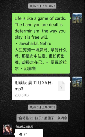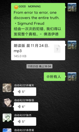 新老成员见面会结束后,英语欧林小组的学习训练活动持续进行着,为了锻炼成员们的口语能力,在去年“趣配音”的基础上,特别加上了“每日英语一句”,在锻炼口语的同时,也能让成员得到学习积累,以及把英语以名言警句的方式呈现在大家面前,使其更加贴切我们的日常生活,更是能帮助我们了解其中的英语文化蕴含。
