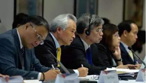 图为7月5日,在美国首都华盛顿,中国南海研究院院长吴士存(左二)出席中美智库南海问题对话会。来自中国和美国的20多名专家学者5日齐聚美国华盛顿卡内基国际和平基金会,就南海问题举行对话会。与会专家学者认为,菲律宾单方面提起的南海仲裁案建立在非法诉求基础上,背后隐藏着不良政治图谋,中国完全有理由不参与、不接受仲裁。南海问题相关国家应共同努力为局势“降温”,中美两国也应管控好分歧,防止其对中美关系全局造成损害。新华社记者鲍丹丹摄