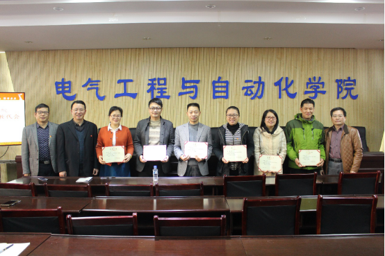 最后,由林元璋宣读学院“关于公布2017年电气工程与自动化学院青年教师教学技能竞赛结果的通知”,刘飞飞、钟建华为学院2017年青年教师教学技能竞赛获奖教师颁发荣誉证书。其中,陈德海荣获一等奖,曾璐、汪涛荣获二等奖,韩树人、焦海宁、周发助荣获三等奖。